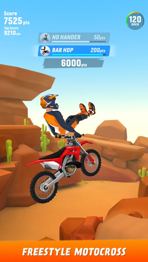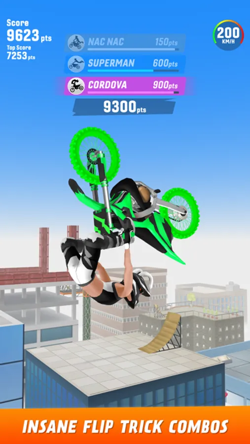Tsunami, Seat-Grab, Bar-Hop, Cordova and the list of tricks goes on. Combine mad tricks and get crazy scores. Pump your adrenaline with high speeds and extreme motorbike jumps. Be a tricks master.