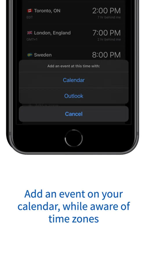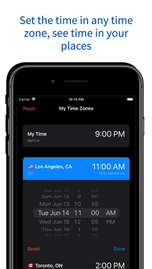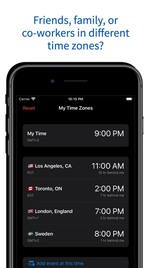 You are in New York City, and you are wondering what time it would be in London when it is 3pm tomorrow in Sydney. Tap Sydney, set the time, and watch your time zone list update to reflect that time!