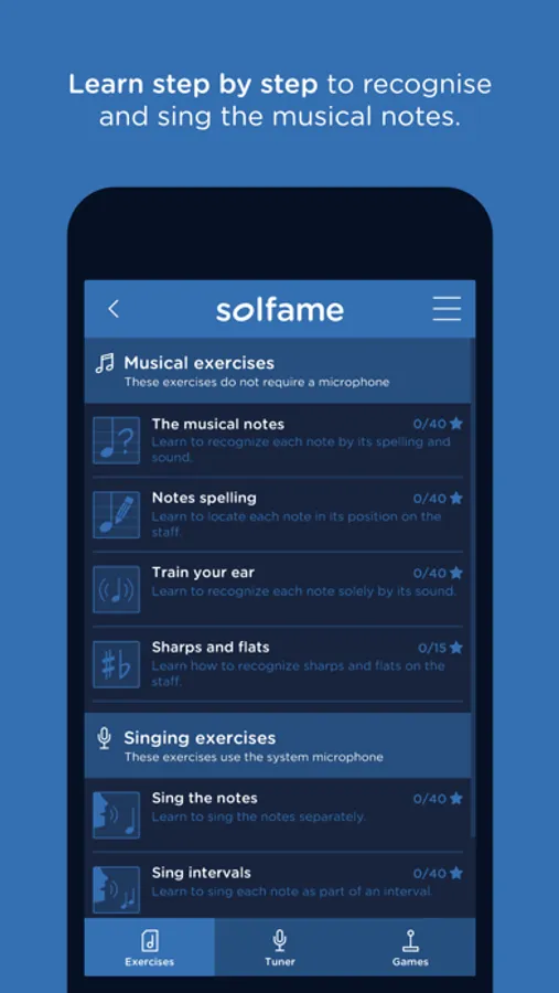 Learn, step by step, to recognize and sing the musical notes. SolFaMe includes a voice tuner and a number of challenges designed for amateurs and experienced singers alike.