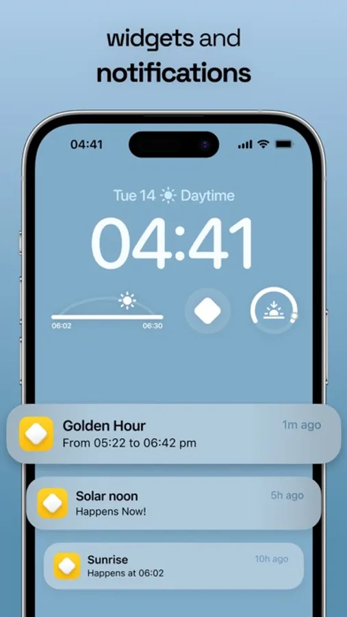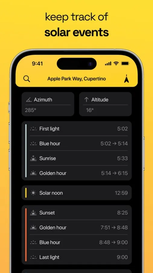 From stunning sunrises to captivating sunsets, and every celestial event in between – solar noon and midnight, twilights, golden and blue hour, first and last light, azimuth, altitude, equinoxes, solstices, day and night length – Sunlitt keeps you in sync with the sun's majestic journey.