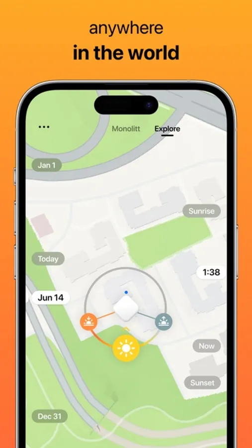 Explore mode enables you to check the sun's direction anywhere in the world. Simply pin your position and unveil the sun's orientation at any specific moment and location. Save your favorite spots for easy access.