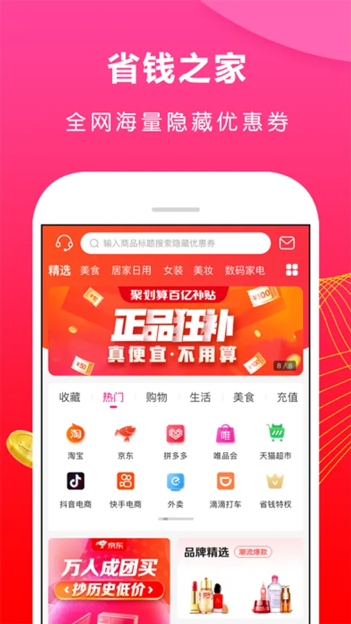 省钱之家是一款网购返利省钱APP,汇聚淘宝、天猫、京东、拼多多、唯品会、苏宁易购、考拉海购、抖音、快手、美团、饿了么等各大电商平台隐藏优惠券、内部优惠券,覆盖吃喝玩乐购等本地生活优惠,平均每年为用户节省数千元,省到就是赚到,0手续费极速提现
