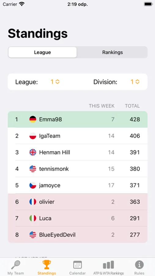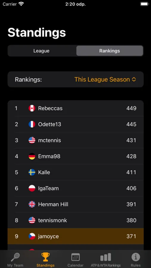 You compete in a league (with a promotion/relegation system) and you can also check weekly/seasonal rankings. The app also provides ATP & WTA rankings and tournament results.