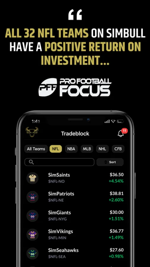 SimBull combines the thrill of sports gambling with the profitability of stock market investing. The result? The world’s only Stock Market for Sports giving people like you the opportunity to profit from your sports fandom by buying & selling NFL, CFB, NBA, MLB, & NHL teams.