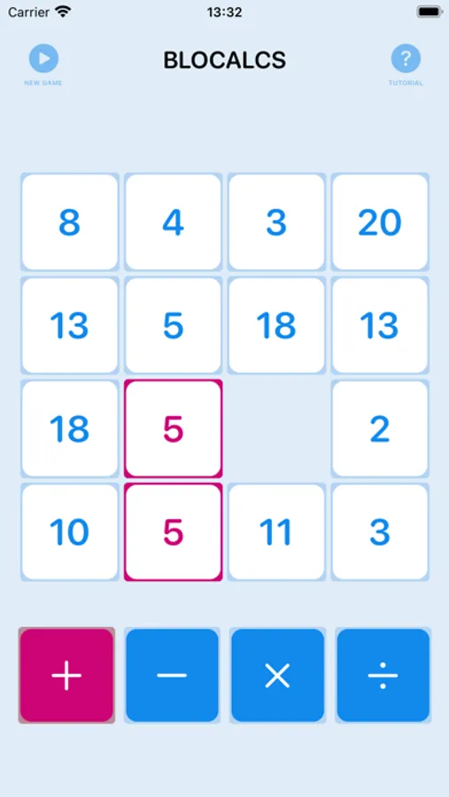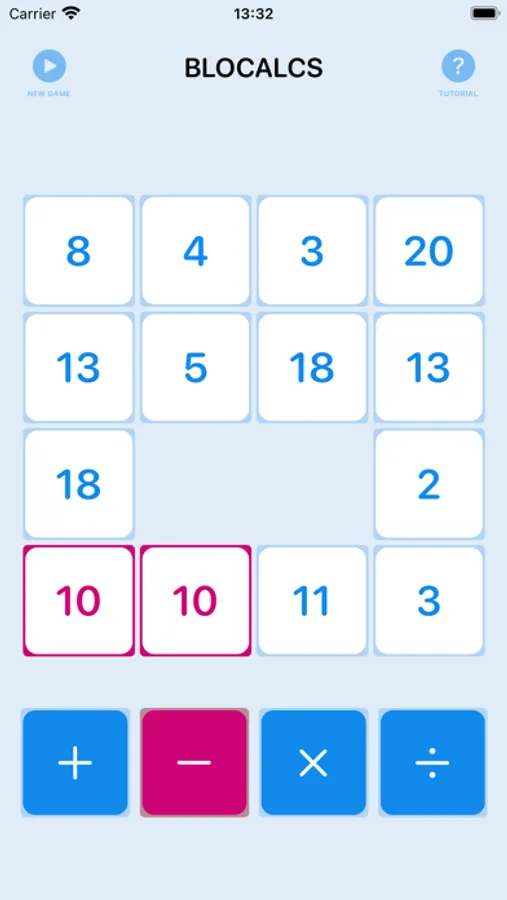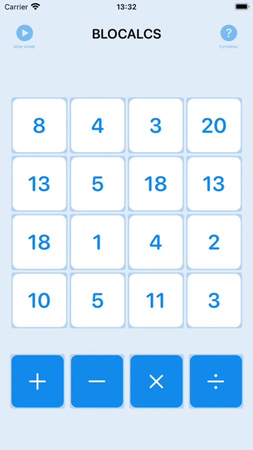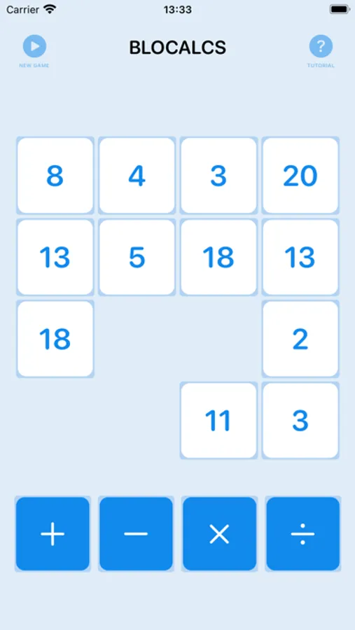 Blocalcs is a puzzle where you have a grid with 16 numbers and you have to clear it by doing calculations. You must choose two blocks and the operation. The first block will do the operation with the second, being erased, and the result will replace the value of the second block. If the result is zero, both blocks will disappear. You win if all blocks disappear.