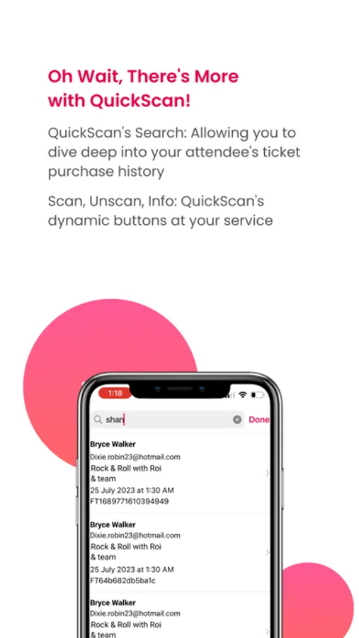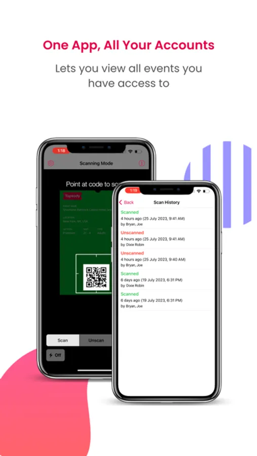 QuickScan’s dynamic buttons allow for easy scan, unscan, and access to attendee info. Dive deep into your attendees' ticket purchase history with the ticket scanning app’s efficient search. Ideal for managing multiple accounts, the mobile app provides access to all your events in one place.