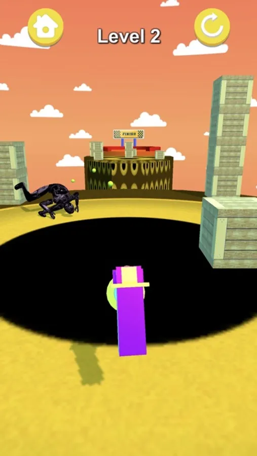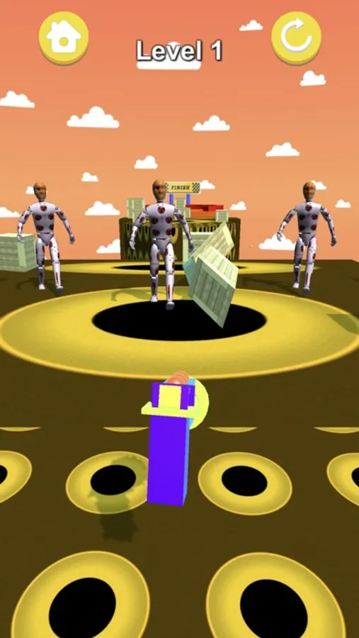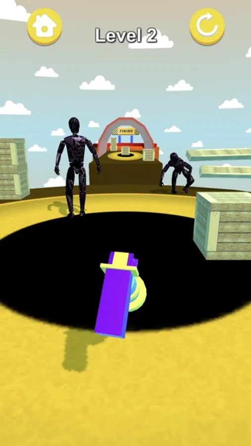 Shoot the enemy with a rubber gun until the enemy actually falls to the cliff, then Jump from building to building to reach the finish point.