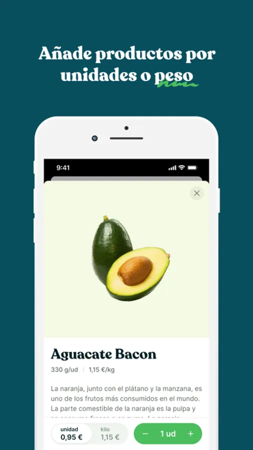 • Escoge entre una amplia selección de la mejor fruta y verdura y añádela a tu cesta por unidades o peso. Puedes complementar tu pedido con productos de despensa directamente de productores nacionales así como productos locales de tu ciudad: huevos, pan, aceites, quesos y mucho más.