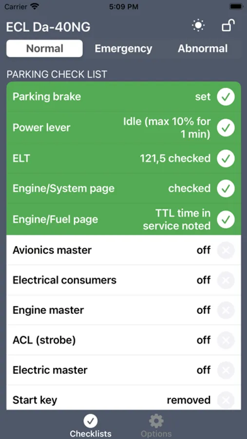 This is an electronic checklists app for Diamond Da-40NG aircraft.
