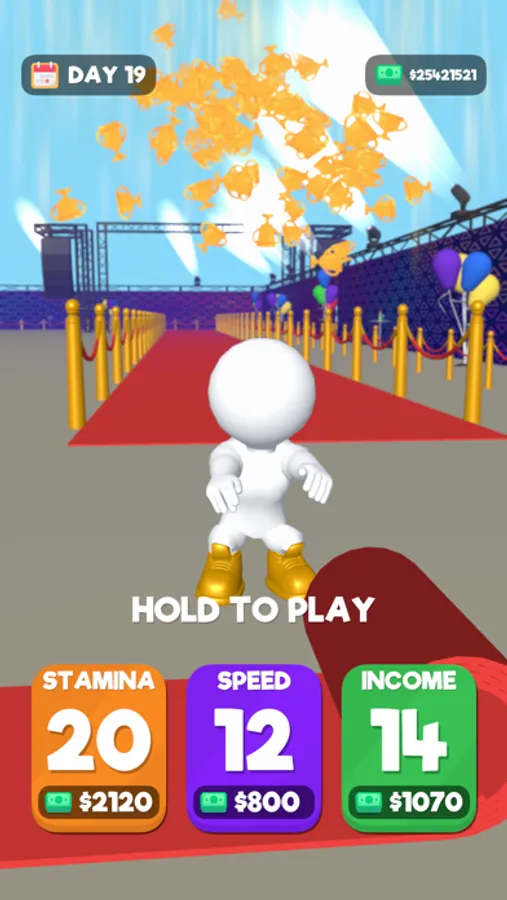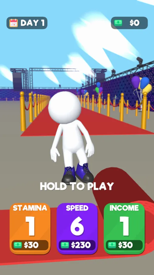 Roll the carpets, improve your abilities and shoes to gain even more chance to earn more money, and the show will go on! Remember, avoid wearing out your character for him to stay in one peace!