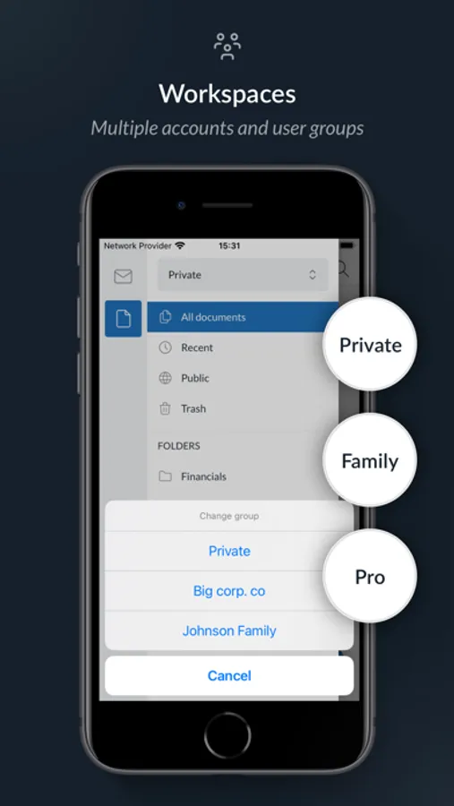 • Workspaces : Share mailboxes, drives and collaborate in shared workspaces. Advanced sharing rights managed by group administrator.