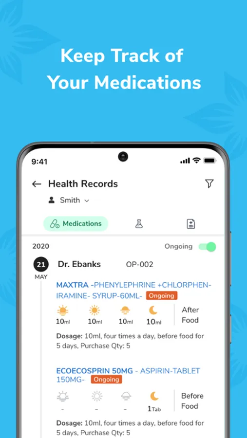 - Keep track of your Medications, Reports, Visit and Discharge summary