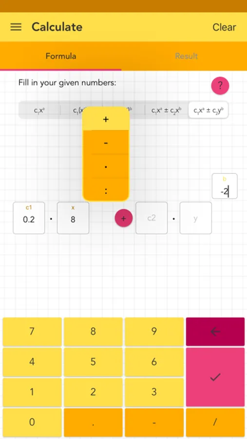 Decimals, fractions and negative values are supported. The solution is shown step by step. All calculations are stored in the history. The final solution can be shared.