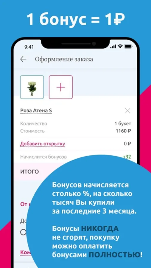 После того, как Вы выбрали букет, можно внести особые пожелания, например, анонимная доставка или открытка с индивидуальным текстом. Оплату можно произвести сразу в приложении.