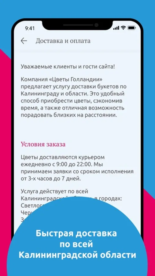 Зона доставки покрывает Светлогорск, Советск, Гвардейск, Черняховск, Балтийск, Гусев, Зеленоградск, а также другие города и населенные пункты области.