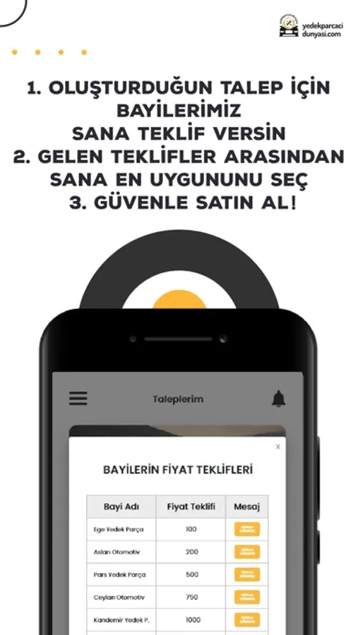Yedek Parçacı Dünyasında aradığınız yedek parçalar için talep oluşturun , dükkan dükkan gezmek yerine aradığınız yedek parça için bayilerimiz size teklif versin !