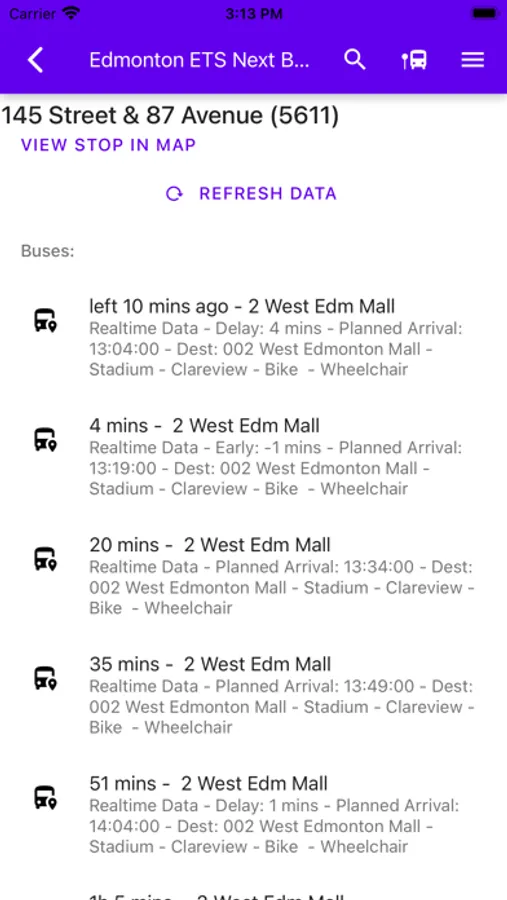 Data is in real-time from Edmonton's Open Data GTFS (Transit Feed System). When real-time data is not available, it will show scheduled data.