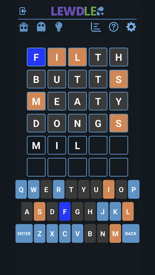 Try to solve the LEWDLE by guessing all the filthy words you know in this lewd spin on a classic word game puzzle. Don't know a word? Don't worry! Lewdle has unique definitions for each word so you can improve your lewd vocabulary.