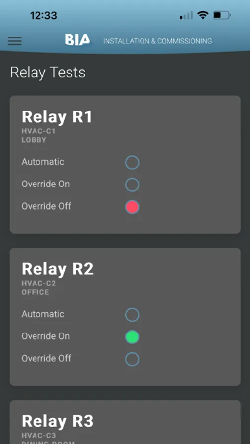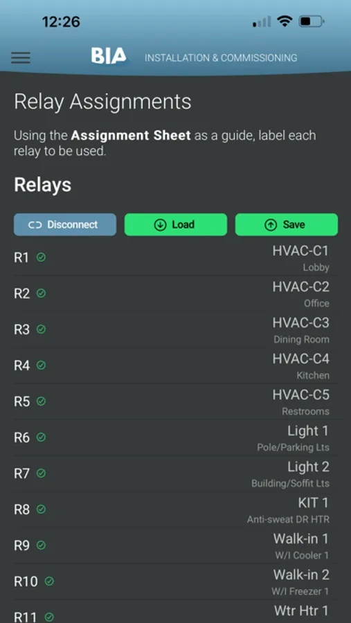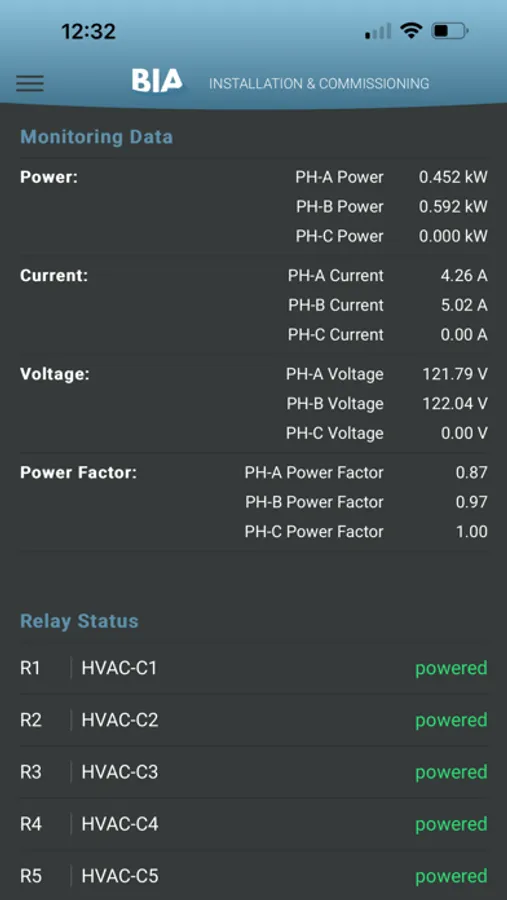 The BIA Controls Installer App facilitates DemandHub installations by configuring the system, verifying power metering, adding or removing sensors, and configuring relay controls. A live status capability allows the installer to check real time information regarding the system devices and configuration to ensure that all demand meters, sensors, and relay controls are fully operational.