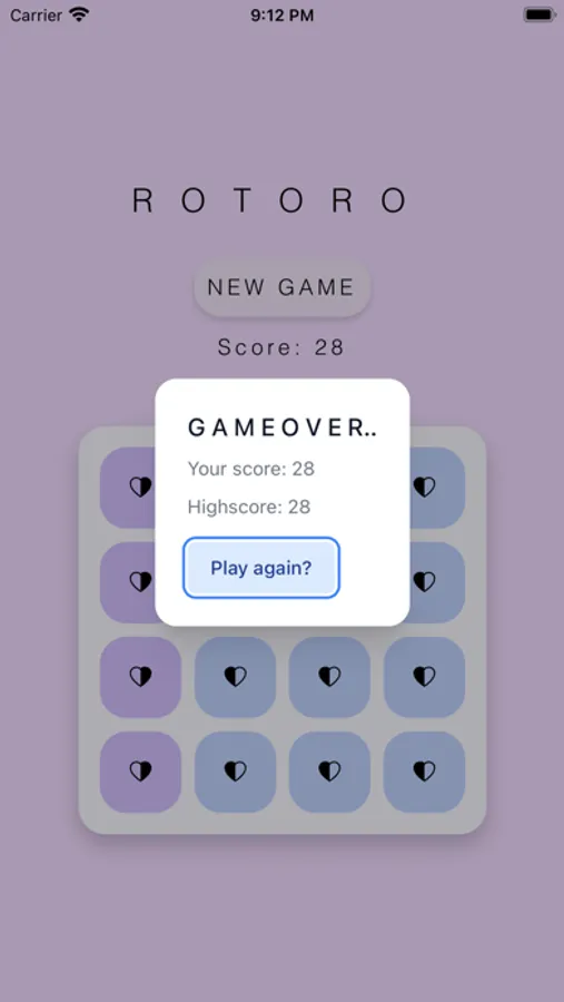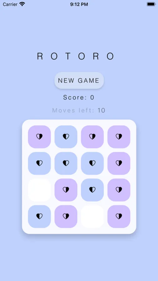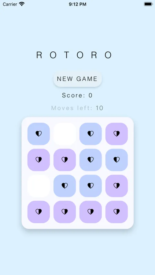 Rotoro is a puzzle game influenced heavily by games such as 2048. Your objective is to climb to the highest score by connecting two sides of your hearts. Once they've combined, they disappear and give you points. Each slide down requires a move until you run out of moves. Climb to the highest score you can with this simple, calming game.