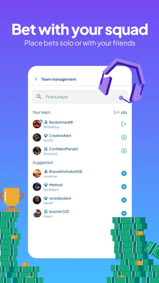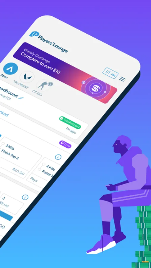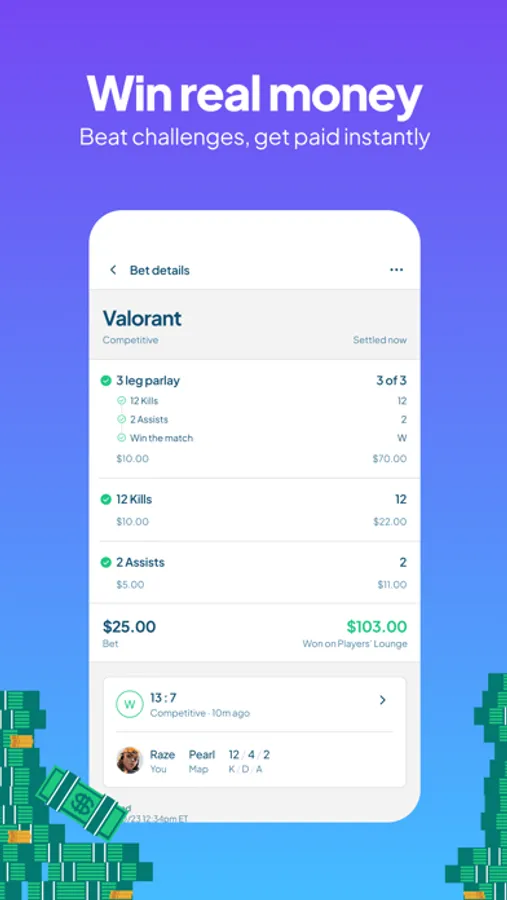 Bet on yourself and win cash playing your favorite games! Bet on your performance in Apex Legends, VALORANT and more. Take challenges like how many kills you'll get, how much damage you'll do, or whether you'll win the game straight up. Play solo or with your squad. Beat your lines to get paid.
