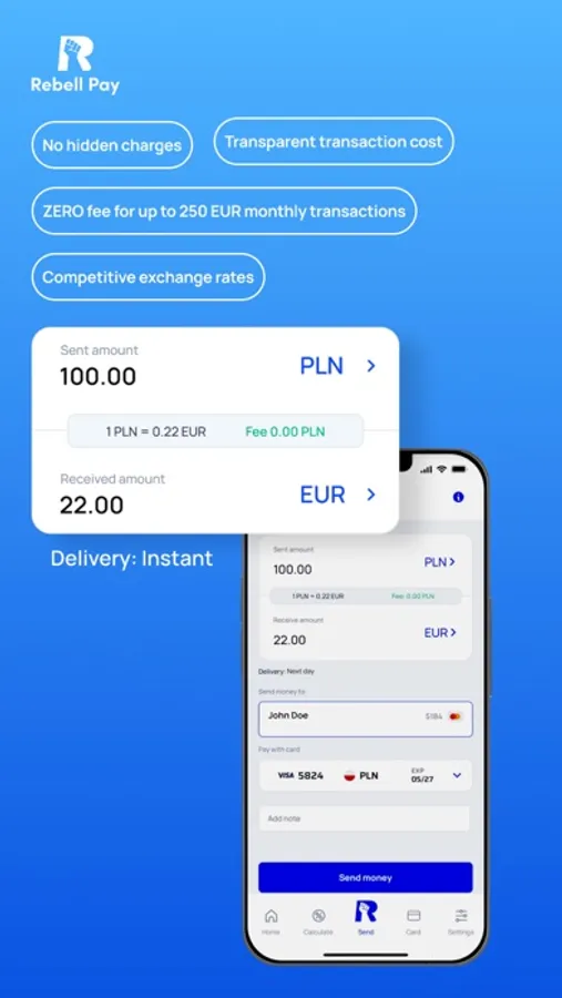 Benefit from fair FX rates and zero additional fees for transactions up to 250 euro within 30 days. Rebell Pay is the solution for instant, secure, and trustworthy money transfers. Send money 24/7 directly between Visa and Mastercard.