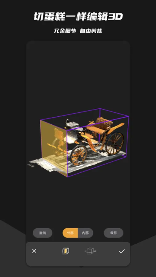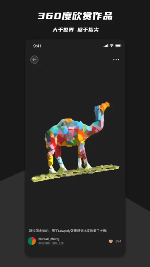 使用「在场 App」,你可以像拍一段小视频一样,将面前的场景用3D的形式扫描下来。你还可以通过剪裁修整和风格滤镜,编辑扫描出的模型,制作出更酷更艺术的3D作品。