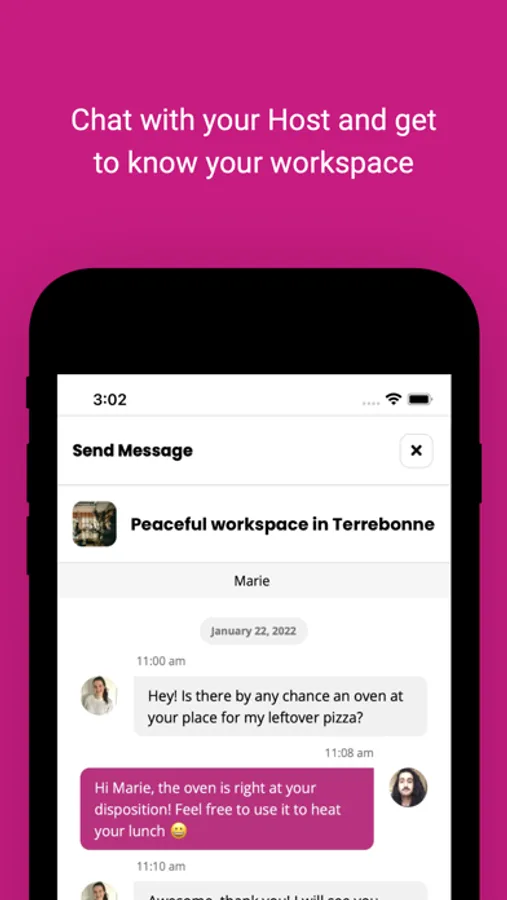We value the feel at home experiences - so Telework provides in the app a chat room letting you discuss with your Host any matter regarding your upcoming reservation or even during your stay. Just head to the « My reservations » section in your Dashboard and select the one you want to start a conversation about.