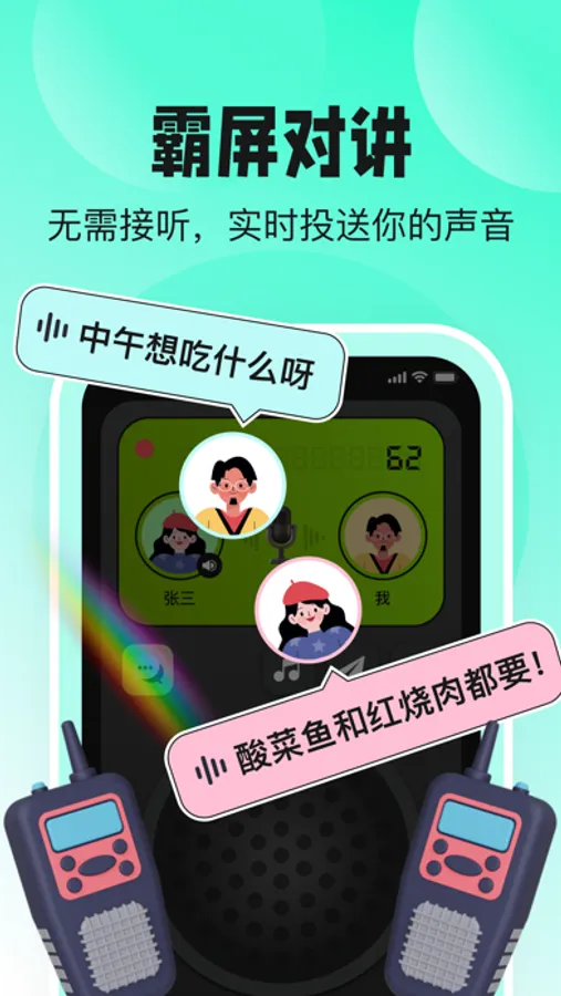 -让你的手机秒变对讲机,对方无需接听,实时的把你的声音投送到TA的手机上;