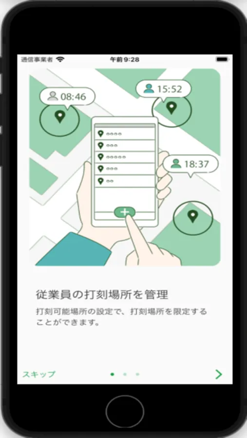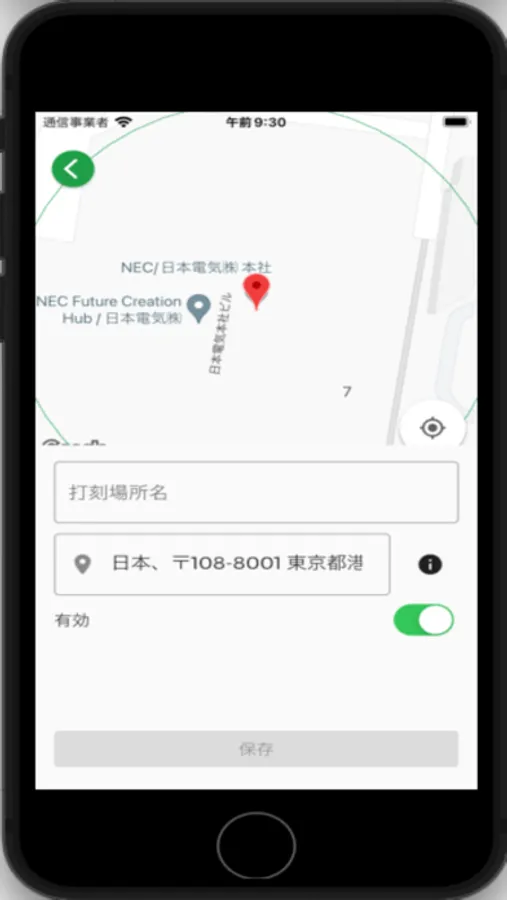 本サービスでは管理者が従業員の打刻可能エリアを設定し、設定した範囲内にいる場合に限り本アプリにて打刻できるようになります。