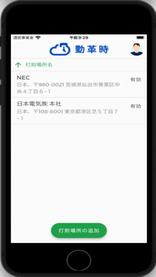 場所は複数登録できるので、ある日はA拠点で出勤打刻し、その後移動した先のB店舗で退勤打刻、またある日は在宅勤務のため自宅で出退勤打刻、といった場合にも対応できます。