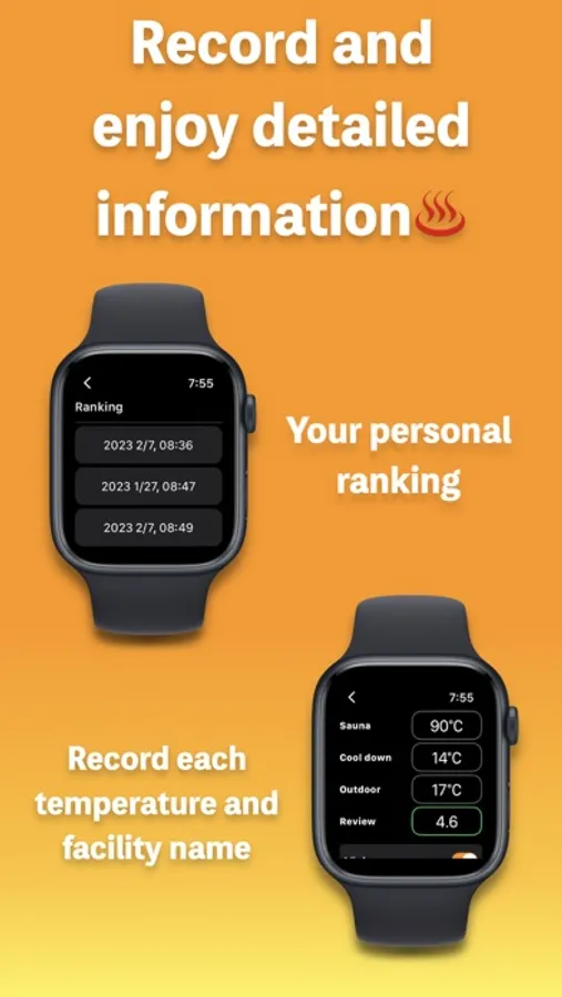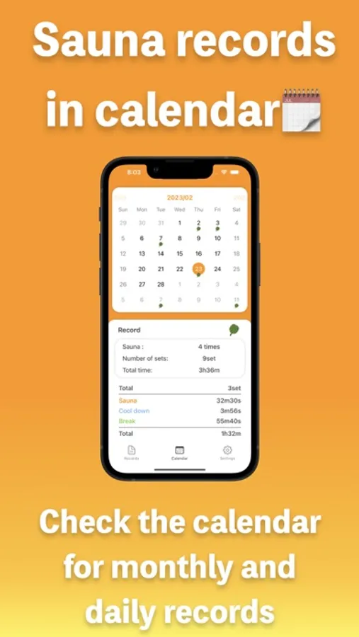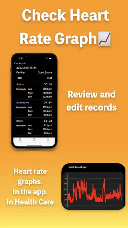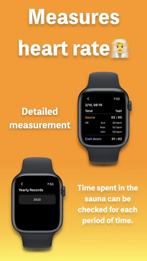 Sauna Record records the time and heart rate for each set of sauna, water bath, and rest, and the estimated sweat volume in the sauna.