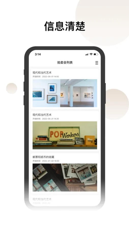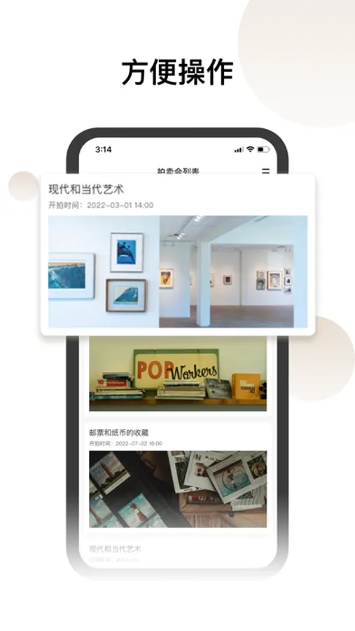 4、【优质拍行,一触即达】具有影响力的优质拍卖行和权威艺术机构签约入驻,提供有品质保障的拍卖会。