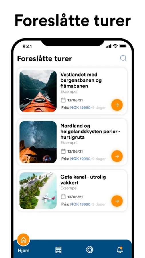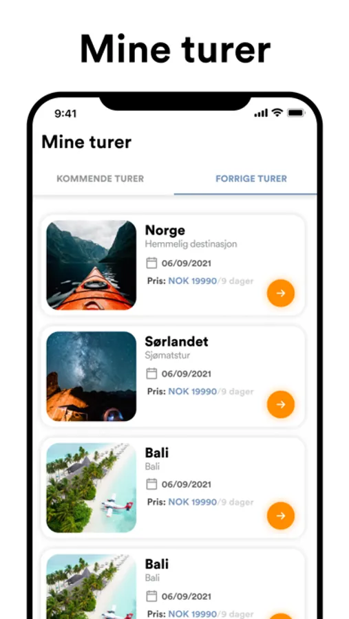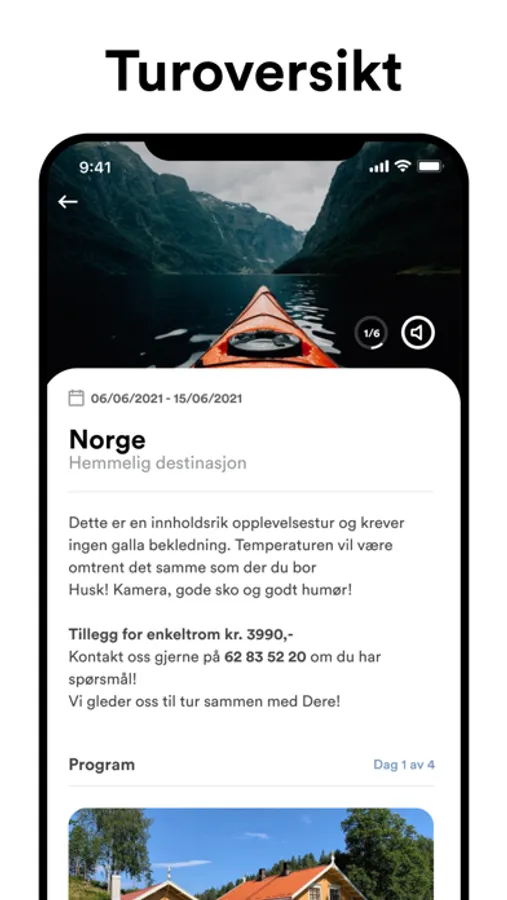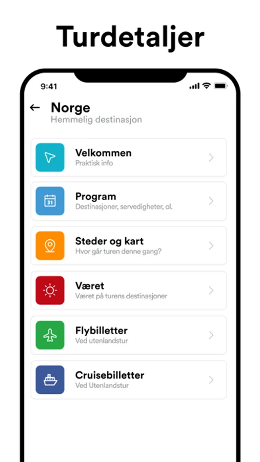Når tidspunktet for avgang nærmer seg, vil du få tilgang til turinformasjonen din i applikasjonen. Her vil du kunne se dagsplan, reisemål, snakke med turleder og eventuelle fly- og cruisebilletter vil bli lastet opp.