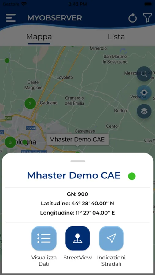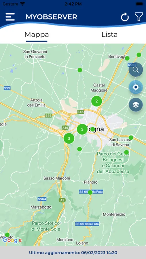 All'avvio si ha una visione d'insieme di tutta la rete, distribuita sul territorio utilizzando la base cartografica delle mappe Google, per avere un quadro generale della situazione mediante l'utilizzo di marker colorati associati agli stati delle stazioni.