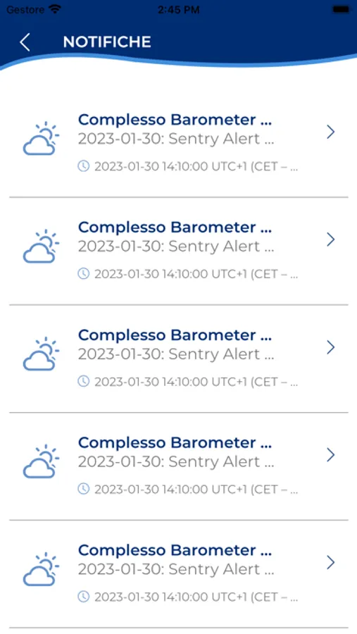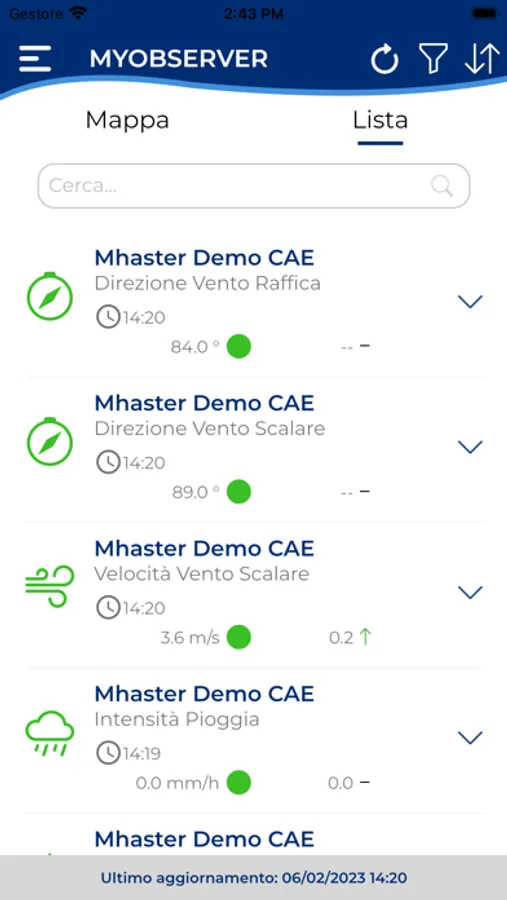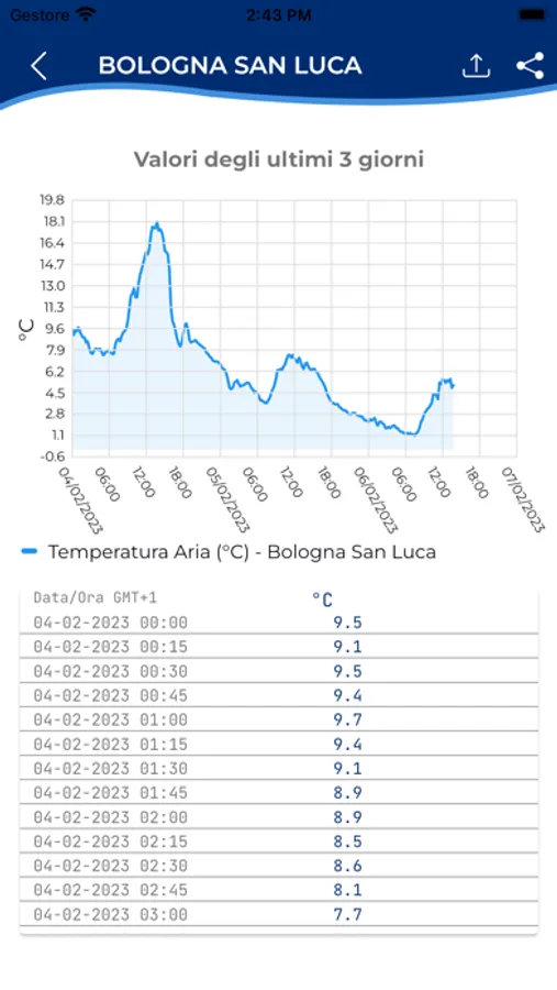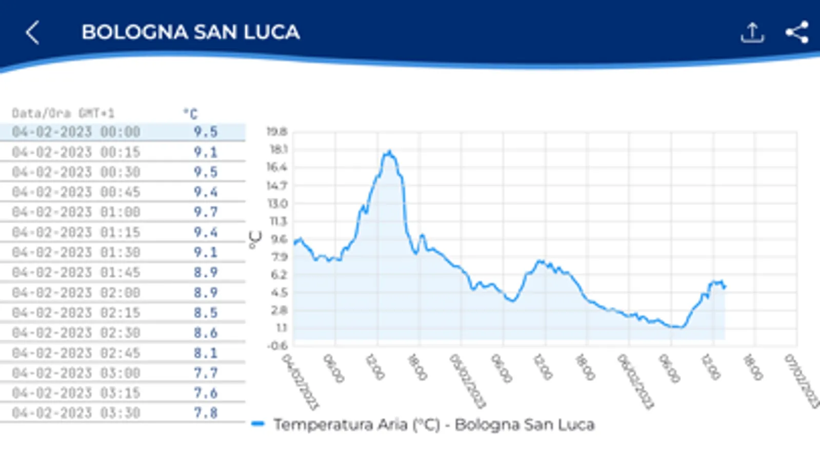 Su ogni punto di monitoraggio, con un semplice tap, sono disponibili varie azioni, ad esempio passare al dettaglio di tutti gli elementi. In tal caso l’app mostra una vista tabellare nella quale poter analizzare valore, incremento e stato di ogni singolo elemento registrato. Da questi, con un altro tap sull’elemento, si richiama il grafico dei dati acquisiti in centrale, mostrando fino a 7 giorni ed eventualmente confrontandoli con altri elementi della stessa o di altre stazioni. È possibile zoomare il grafico e mostrare i singoli valori registrati. Per apprezzare maggiormente i fenomeni di pioggia è inoltre disponibile il grafico in forma di istogramma con l’aggregazione scelta dall’utente.