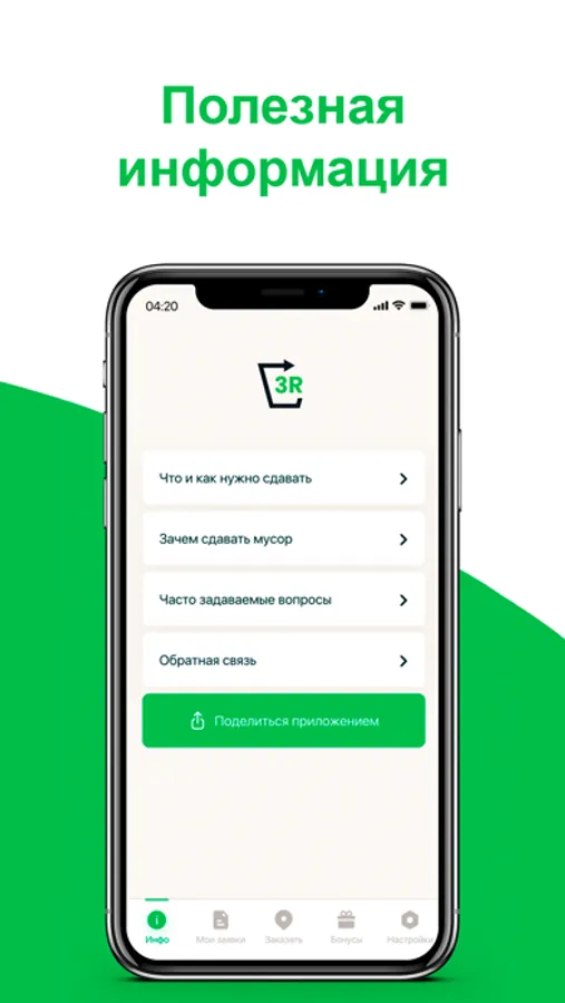 Мобильное приложение для вывоза и сбора вторсырья с конкретного места, указанного клиентом. Комфортное решение проблемы мусора — одним нажатием кнопки. Приложение позволяет оставлять заявки на сбор отходов, получать за это бонусы и тратить их на мерчендайз и дополнительные услуги компании.