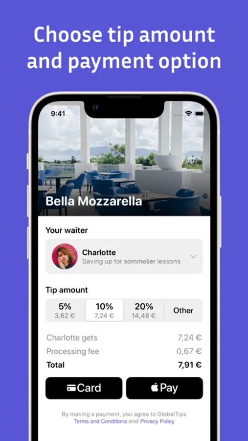 2. Choose tip amount and payment method. In addition to Apple Pay, GlobalTips accepts a wide range of credit and debit cards.