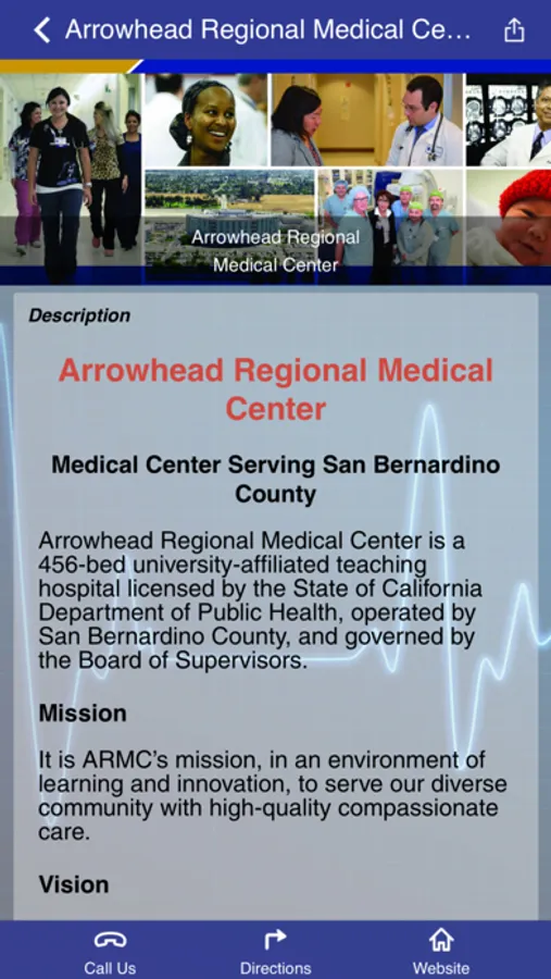 Arrowhead Regional Medical Center is a 456-bed university-affiliated teaching hospital licensed by the State of California Department of Public Health, operated by the County of San Bernardino, and governed by the Board of Supervisors. It is ARMC’s mission, in an environment of learning and innovation, to serve our diverse community with high-quality, compassionate care. The hospital, located on a 70-acre campus in Colton, California, operates the Edward G. Hirschman Burn Center, a level II trauma center, a primary stroke center, a behavioral health center, and five primary care centers. ARMC also provides more than 40 outpatient specialty care services. ARMC is helping to achieve the countywide vision by addressing the community’s wellness and educational needs.