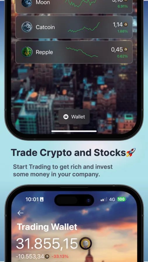 If you're up for some financial action, you can participate in the trading system, where you can trade cryptocurrencies or company stocks. Become an expert in the dynamics of the financial market and accumulate virtual wealth!