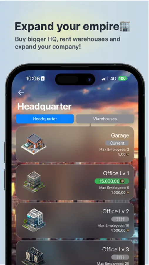 You can expand your headquarters by buying larger buildings and rent warehouses to store your products. Say goodbye to cramped spaces and create a workspace that matches your entrepreneurial ambitions!