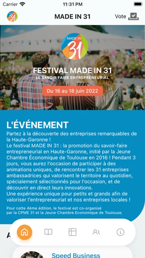 Le festival MADE IN 31 : la promotion du savoir-faire entrepreneurial en Haute-Garonne, initié par la Jeune Chambre Économique de Toulouse en 2016 ! Pendant 3 jours, vous aurez l’occasion de participer à des animations uniques, de rencontrer les 31 entreprises ambassadrices qui valorisent le territoire au quotidien, spécialement sélectionnés pour l’occasion, et de découvrir en direct leurs innovations.
