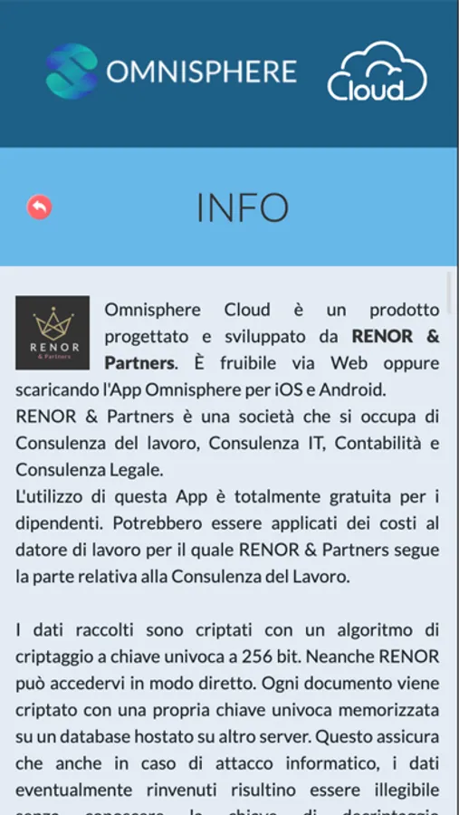 Scarica l'App e consulta la tua documentazione lavorativa in un istante. Le chiavi di accesso ti saranno comunicate tramite mail all'atto dell'inserimento della tua anagrafica nel nostro database. Tutti i dati sono criptati con Algoritmo AES_256_CBC per il massimo della sicurezza. Solo tu potrai vedere i dati in chiaro. Scarica subito l'App Omnisphere.