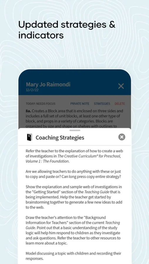 Elevate your coaching practice and boost outcomes for children with Coaching to Fidelity. Access the tools and guidance you need to measure fidelity and effectively guide teachers towards optimal implementation of The Creative Curriculum for Preschool, GOLD, and Infant-Toddlers & Twos. Get best practices tips, tutorials, and access to Teaching Strategies’ enhanced Coaching to Fidelity Strategies and Indicators.