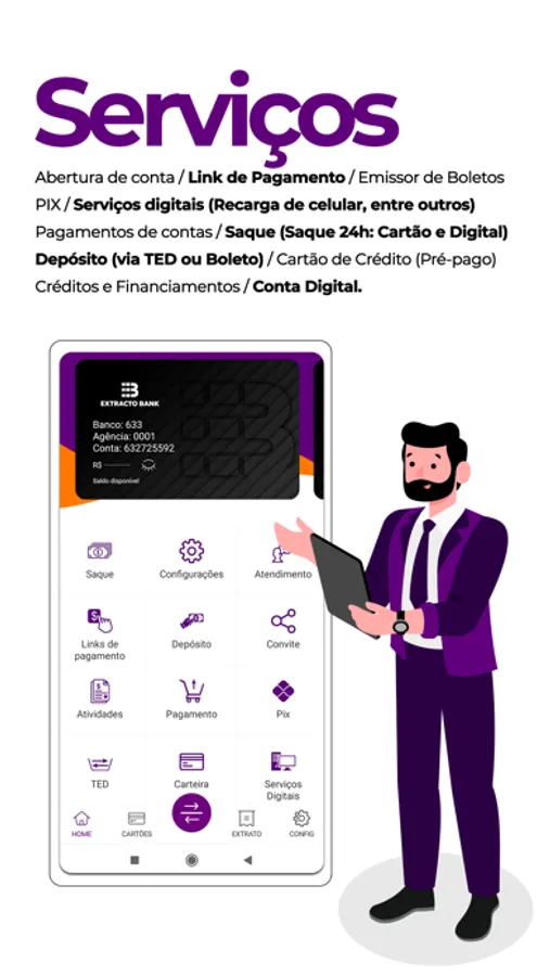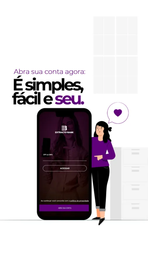 "Abra sua conta digital no Extracto Bank. Evoluímos cada vez mais para que você tenha a melhor experiência, O Extracto Bank oferece uma conta corrente completa e totalmente gratuita!