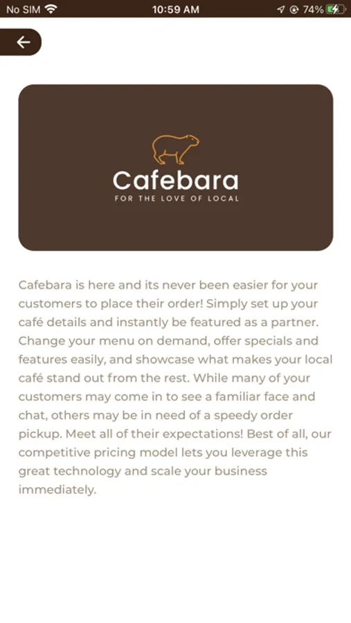 The app allows the café to maintain its configurable menu, set and remove featured promotions, sell merchandise via eCommerce capabilities, and list events to further draw traffic and drive content to the app.