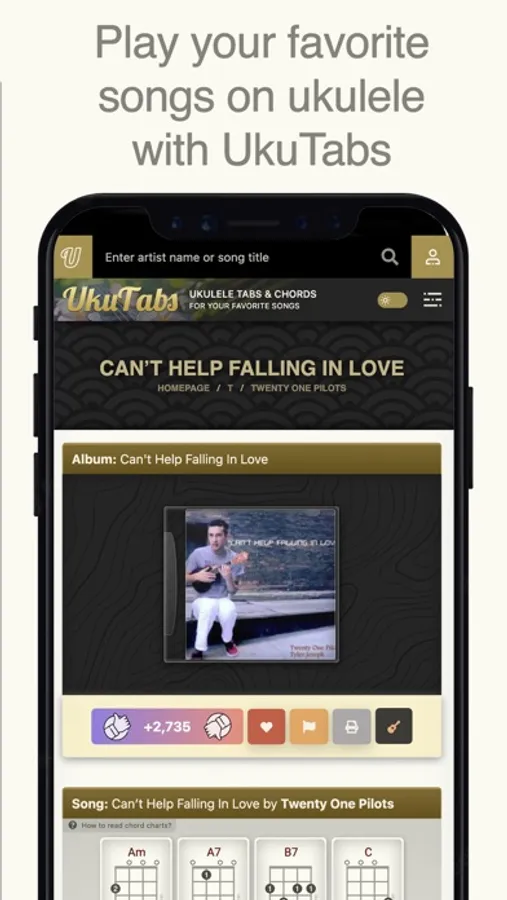Join UkuTabs for free or login with your existing account if you want to save your favorite songs. A working internet connection is required. Enjoy playing the ukulele and join the fun!