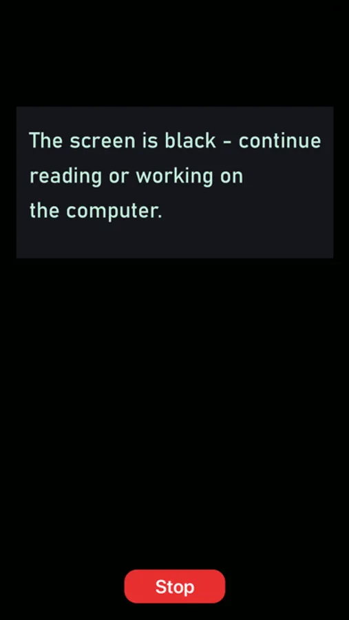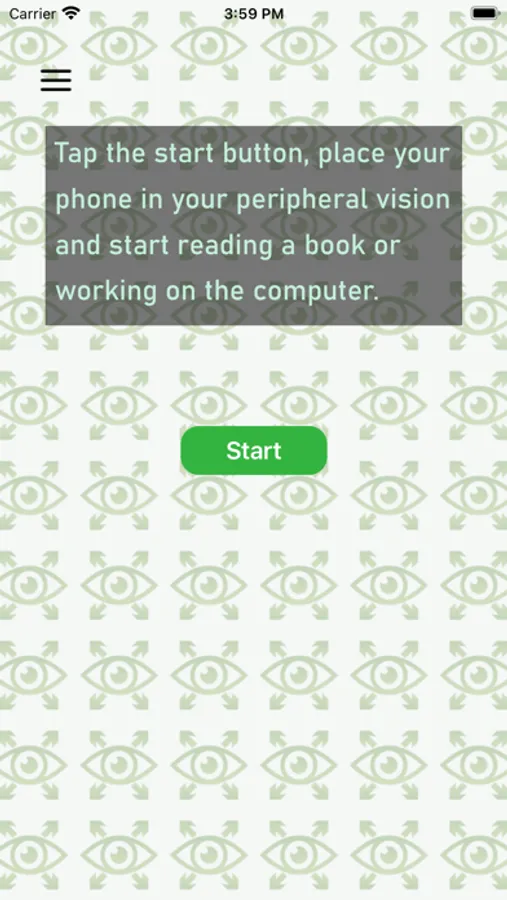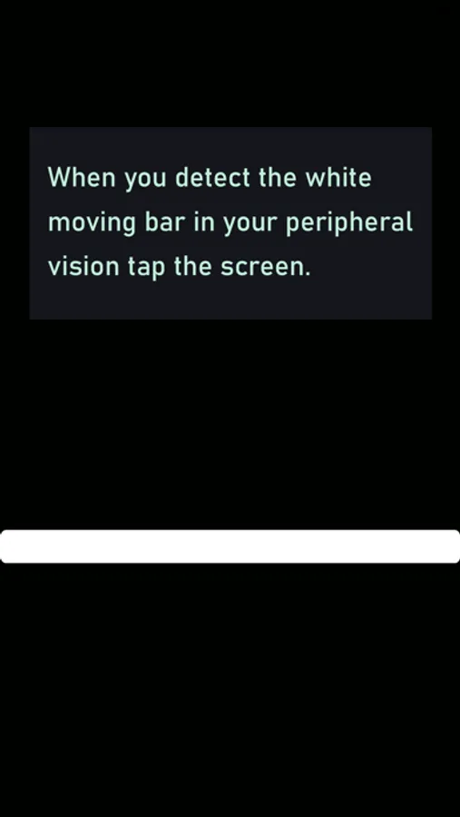 Place your phone within your hand's reach, tap the start button and start working on the computer or reading. After a while the app will show you a moving white bar that you need to detect using your peripheral vision. When you detect the movement, tap the screen of your phone to start a new cycle.
