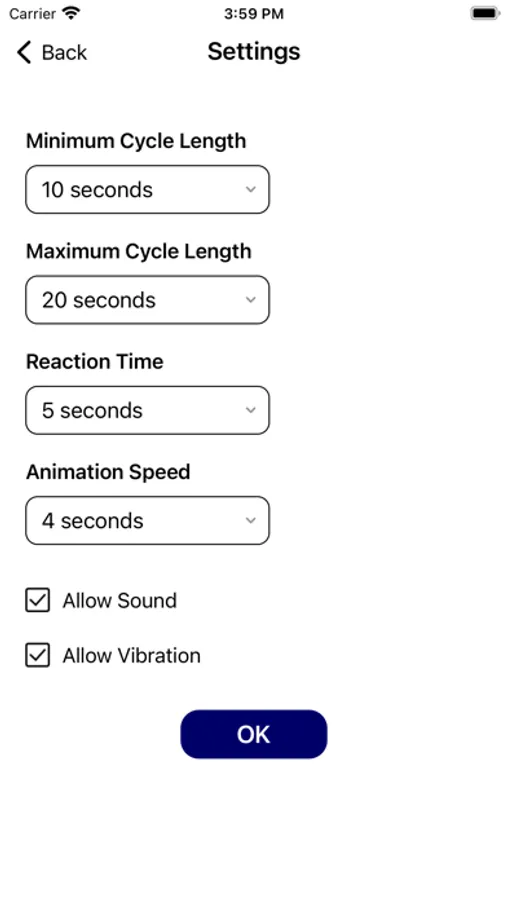 - reaction time (how much time you need to react to the movement before the app reminds you with the sound or vibration)