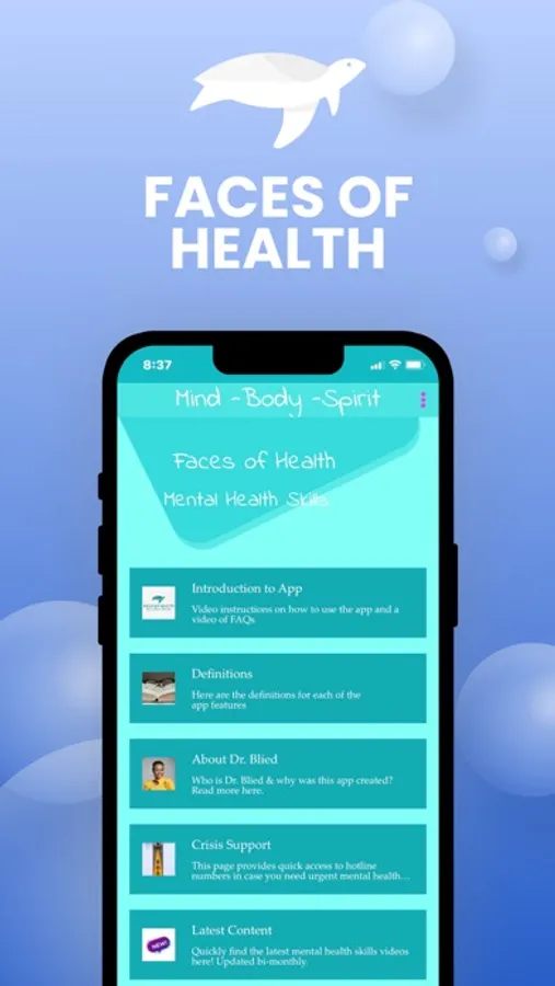 The “Faces of Health” app teaches you skills that work. Use alone or in-between sessions with your therapist. Practice innovative techniques for mental healthcare and stress-management including: